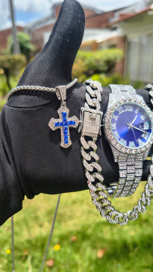 Reloj Plateado Azul + Cadena Cubana + Pulsera Cubana + Dije Cruz Gratis