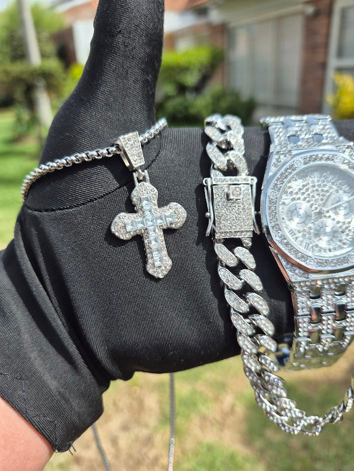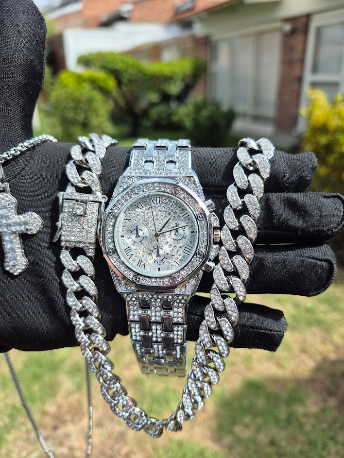 Reloj Hexagonal + Cadena Cubana 50cm + Dije Cubano Cruz