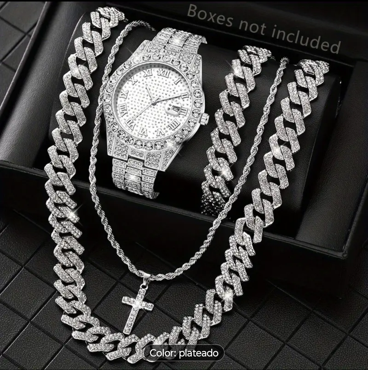 Reloj Plateado Blanco + Cadena 50cm + Pulsera 20cm + Dije Cubano